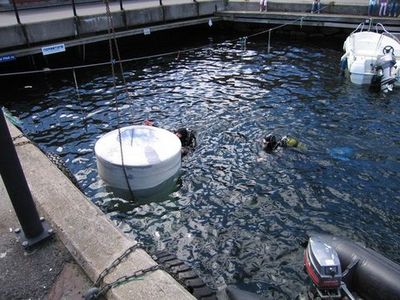 The Risør Underwater Post Office operates in a fiberglass diving bell structure filled with air, secured by a 5-ton weight at 4 meters depth.