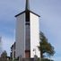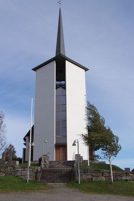 The church building stands in a rural setting, featuring traditional Norwegian architectural elements with white walls and a prominent bell tower.