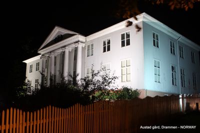 The classicist-style Austad Manor stands on elevated ground with a garden below, featuring a neo-baroque entrance added in 1918.