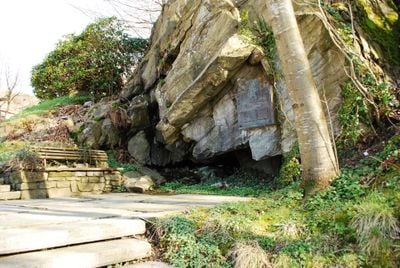 Visitors can reach the cave entrance by climbing granite steps from Nye Sandviksveien, where a platform with benches was installed in 1984.
