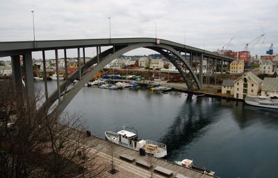 The bridge offers views of traditional Norwegian fishing vessels passing underneath, while cars and pedestrians move steadily across its spanning structure.