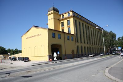 The factory building features a tower with a dome on the fifth floor, marking it as a protected structure on Oslo's heritage yellow list.