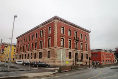 The main entrance displays gothic lettering and includes King Haakon VII's crest on the facade, representing early 20th-century Norwegian architectural elements.