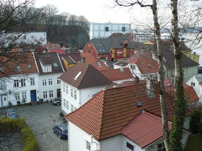 White wooden houses line narrow cobblestone streets leading down to the waterfront, creating a network of residential paths in this northern section of Bergen.