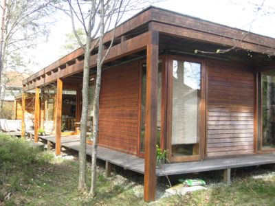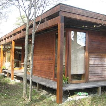 The entire structure follows a precise one-meter module system, incorporating prefabricated wood materials throughout its construction.