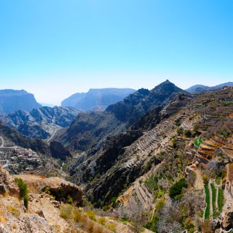 Al Akhdar Mountains is a mountain range in Ad Dakhiliyah Governorate, Oman, with limestone peaks that tower above the surrounding plateaus and valleys. The terrain features steep slopes with agricultural terraces carved into the rock face across its length.