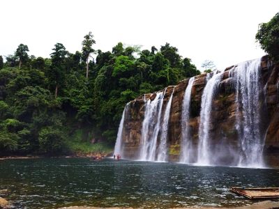 Tinuy-an Falls is a three-tiered waterfall near Bislig where water plunges over limestone ledges in successive stages. The white curtains of falling water create a dramatic display as they descend through the different levels.