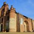 The building displays Earthquake Baroque architecture with distinctive circular buttresses designed to provide extra stability during tremors. The floor features Baldosa tiles with intricately carved three-dimensional patterns that create a striking visual focus when you enter.