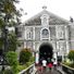 The church features elaborate carvings on the choir loft balcony and rose-colored ceiling paintings that decorate the interior space with traditional artistic elements.