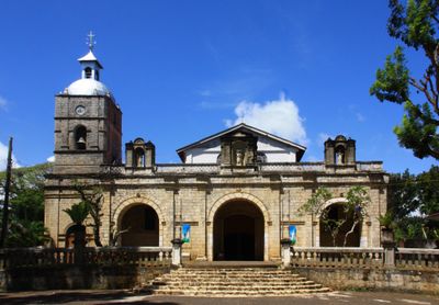 The church showcases Spanish colonial Baroque architecture with Renaissance elements, constructed primarily from coral stone and featuring a distinctive facade with three semicircular archways topped by a parapet with three saint niches.