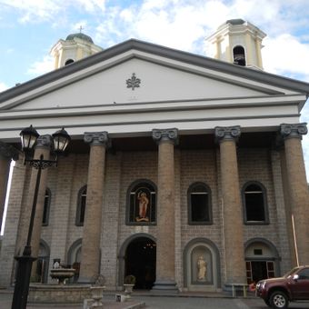 The church features eight Ionic columns on its facade, a central nave with two aisles, and a dome in the barrel vault style.