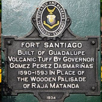 The Fort Santiago historical marker is a cast iron plaque installed by the National Historical Commission of the Philippines, located within the Intramuros walled district. It provides documented information about the fort and serves as a reference point for visitors exploring this historic area.