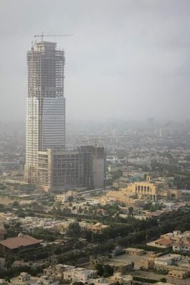 The Bahria Icon Tower stretches 300 meters into the sky with 62 floors above ground and 7 basement levels in Karachi's skyline.
