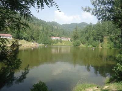 The artificial lake sits at 1,981 meters above sea level, surrounded by dense pine forests and mountains in the Azad Kashmir region.