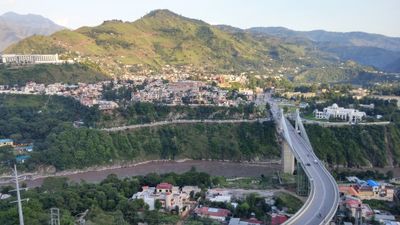 The Earthquake Memorial Bridge extends 474 meters across the Jhelum River, connecting the Naluchi and Chattar districts through its steel and concrete structure.