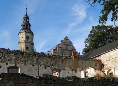 The village contains a notable castle complex with more than 100 interior chambers situated within a 6.6-hectare parkland near Kłodzko County.
