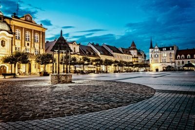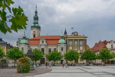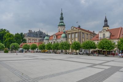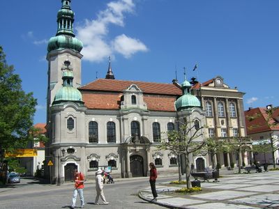 The urban center stretches along the Pszczynka River, featuring a central market square surrounded by Renaissance and Baroque buildings from different centuries.