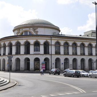 The Exchange and Bank of Poland Building features a corner rotunda crowned with a dome decorated with bas-reliefs depicting figures holding symbols of peace and trade.