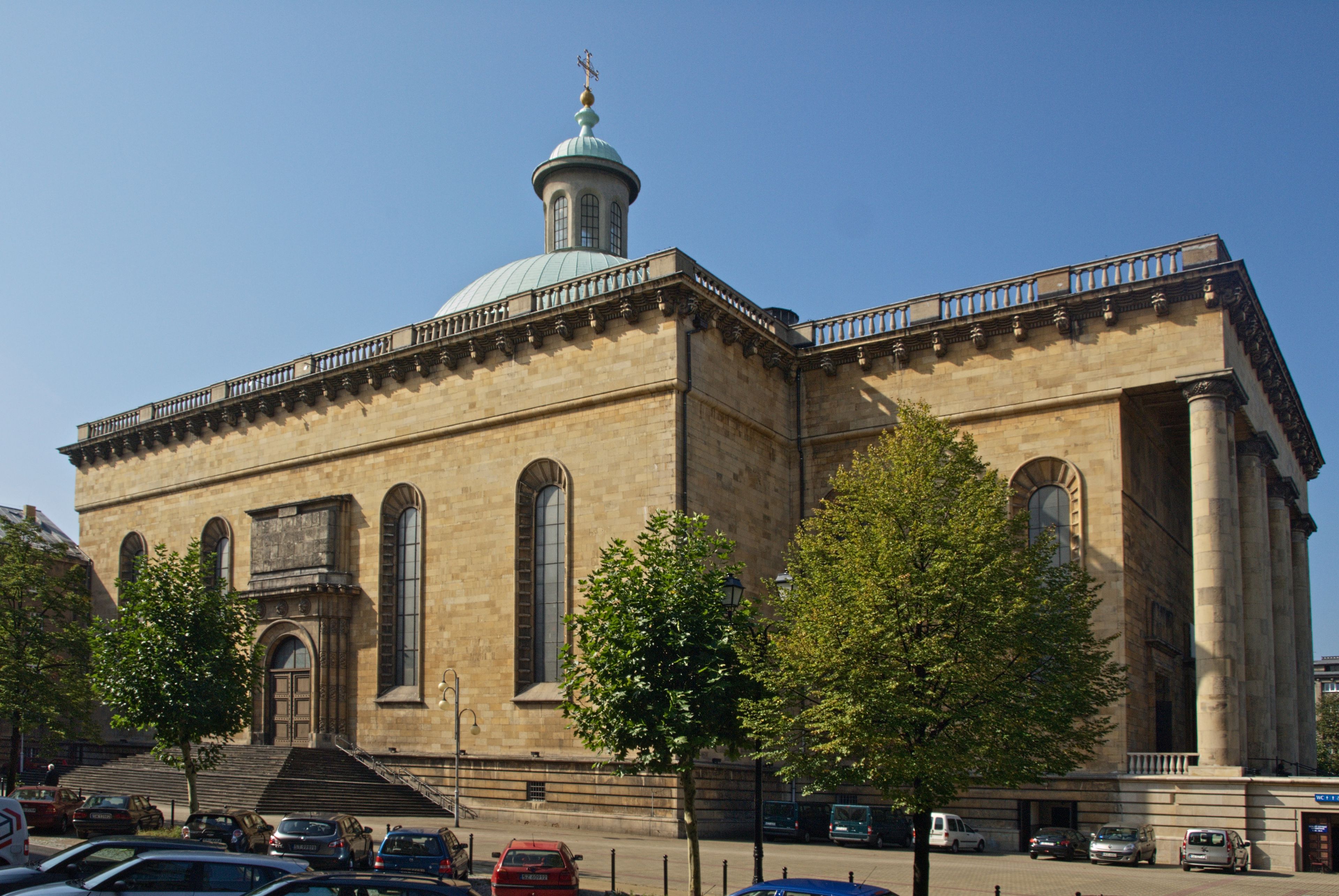 The Cathedral features a massive central dome, stone facades, and an octagonal floor plan with surrounding chapels in the heart of Katowice.