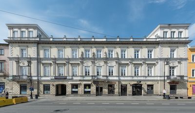 Kossakowski Palace is an urban residence in Warsaw's central district featuring Renaissance Revival architectural characteristics. The facade displays symmetrical proportions and ornamental stone sculptures by sculptor Paweł Maliński that frame its main elements.