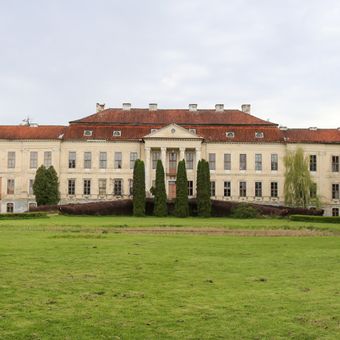 Drogosze Palace is a brick-built Baroque residence with a symmetrical facade, large windows, and decorative details that follow Baroque design principles. The building displays classic features of the period with balanced proportions and ornamental elements across its exterior.