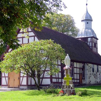 The timber-framed church dedicated to Our Lady of Perpetual Help from the 15th century stands as a central religious structure in the community.