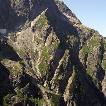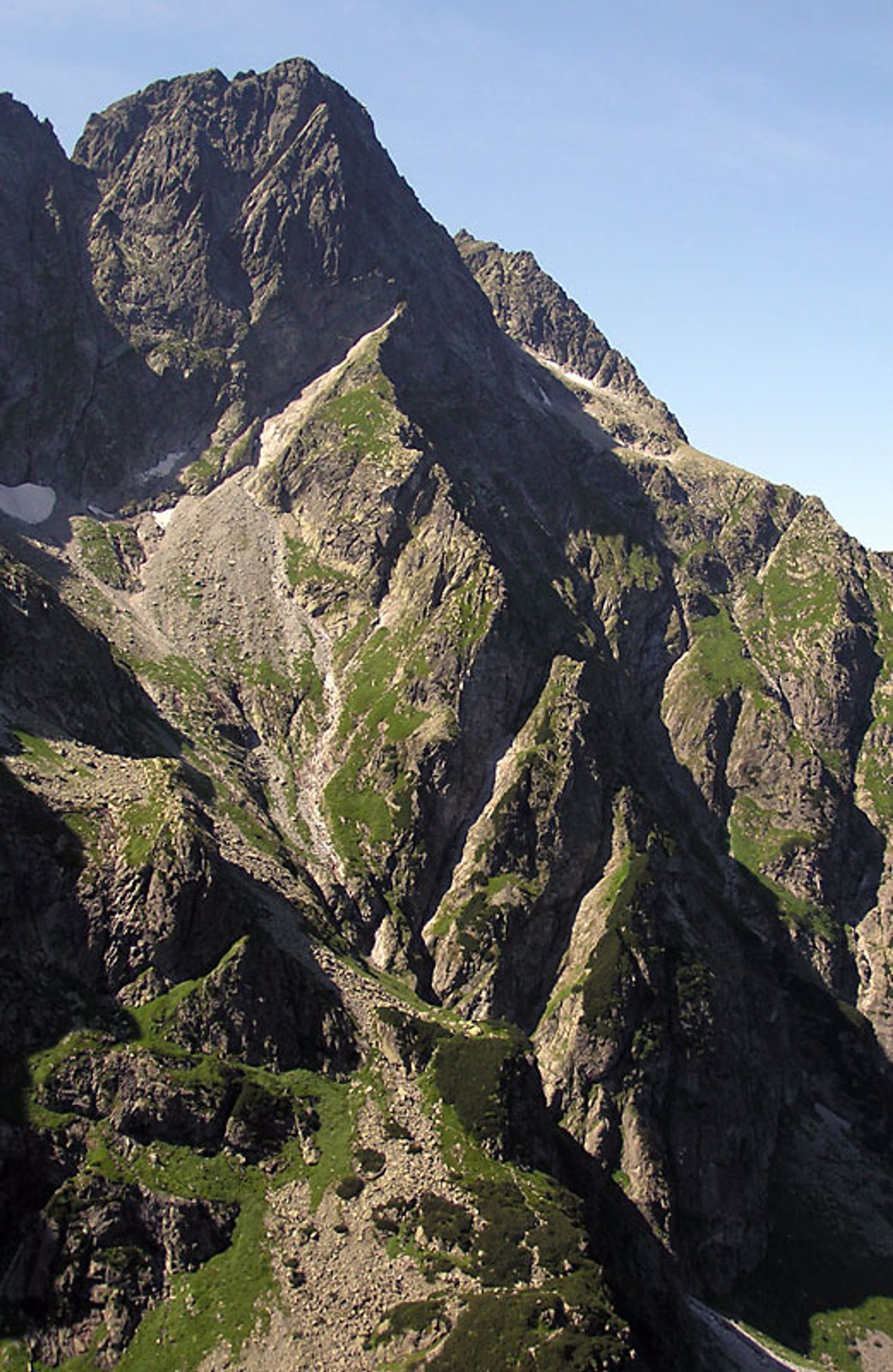 The northern face presents one of the highest walls in the Tatra Mountains, rising 820 meters above the Morskie Oko basin.