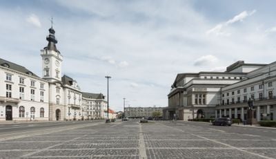 Theatre Square stretches between the Grand Theatre building and Senatorska Street, featuring classical architecture with neo-renaissance elements throughout its perimeter.