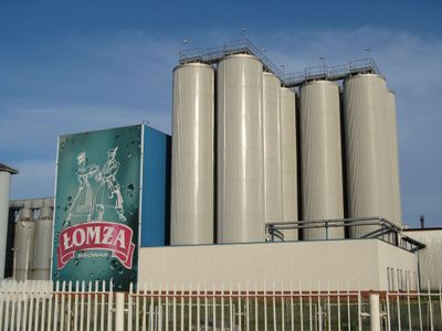The Łomża brewery facility spans across a large industrial complex in northeastern Poland, producing various types of beer including pale, dark, and honey variants.