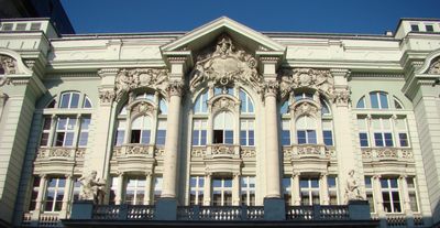 Three symbolic sculptures on the facade represent the combination of technical progress and classical knowledge, created through a dedicated competition in 1904.