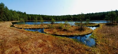The reserve features dystrophic lakes characterized by Sphagnum mat formations, where rare carnivorous sundew plants grow in the specialized bog ecosystem.
