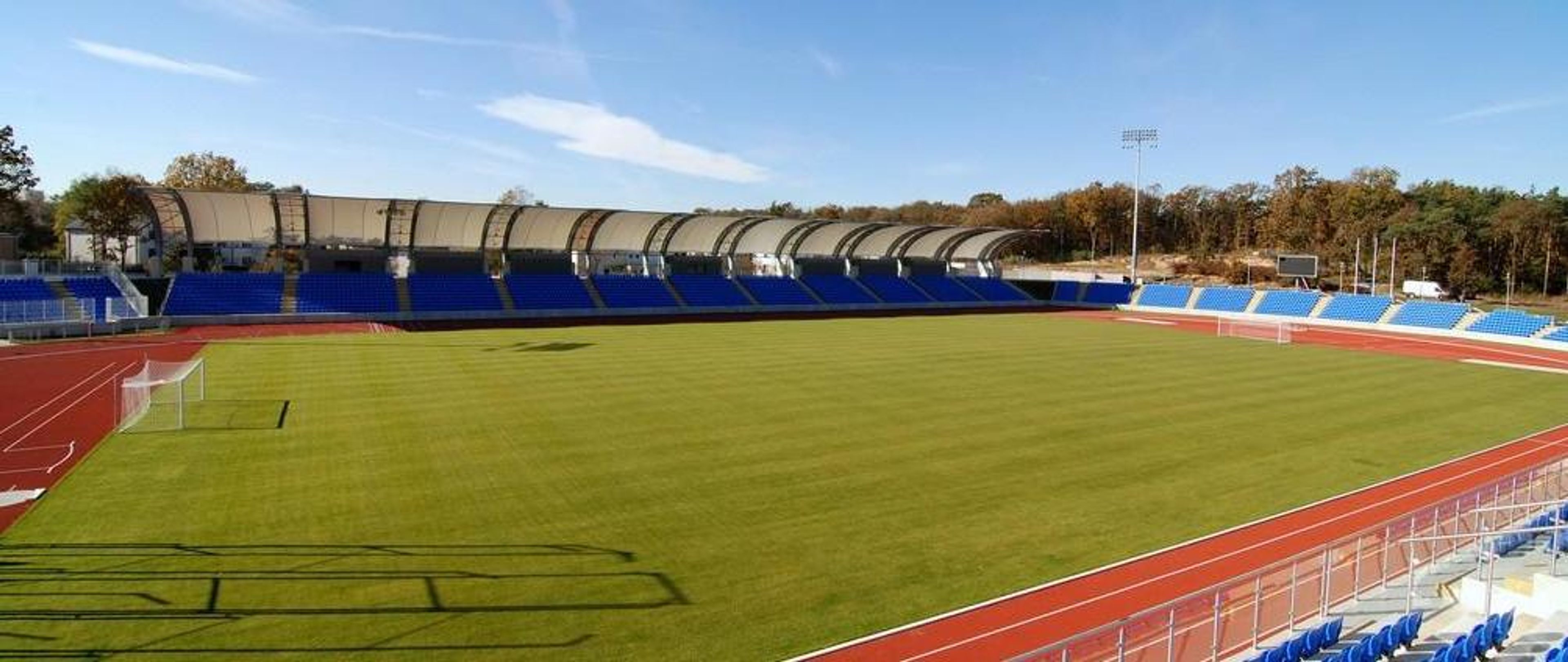 The Stadion MOSiR features a 105-meter by 68-meter natural grass field encircled by a running track and illuminated by 1400 lx lighting systems.