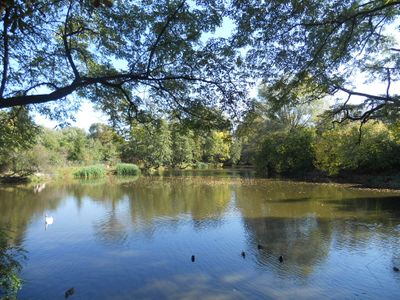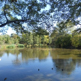 The pond features diverse aquatic vegetation and provides a natural habitat for numerous bird species within an urban environment.