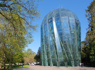 The cylindrical glass rotunda structure stands 24 meters tall and 17 meters wide, housing tropical plants and palms in Adam Mickiewicz Park.