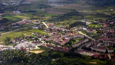 Jasień covers 11.45 square kilometers at an elevation of 111 meters, featuring modern residential buildings and natural green spaces throughout the district.