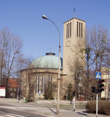 The modernist church building features a prominent altar space and stands as a religious landmark within the urban setting of Bytom.