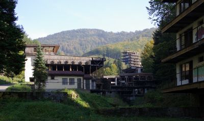 The settlement displays traditional mountain building styles and shows how industrial workers spent their leisure time during Poland's socialist era. The houses and structures reflect a distinctive period in Polish everyday life.