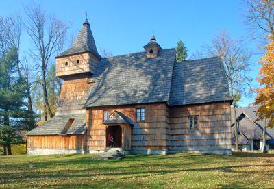 St. Martin Church is a wooden structure built in the Gothic style, consisting of three main parts: a presbytery made from horizontal logs, a central nave, and an added tower all covered with shingle roofing. The interior walls retain old painted decorations featuring religious figures and ornamental designs that depict scenes from the Passion of Christ.