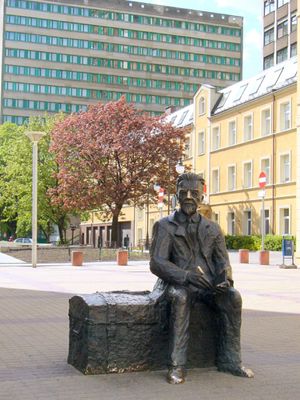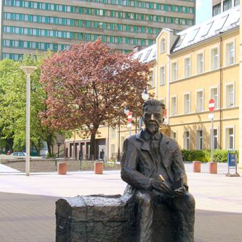 The bronze statue depicts Nobel Prize winner Władysław Reymont sitting on a travel trunk while holding a notebook in his hands.