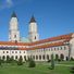 The Saints Nicholas and Stanislaus Church displays a rectangular layout with semicircular apse, single nave, and two western towers connected by side chapels.