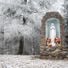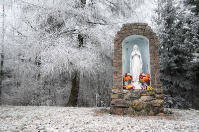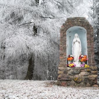 The hilltop houses a stone grotto containing a statue of the Virgin Mary, along with a steel cross mounted on a massive boulder.