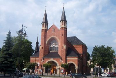 Saint Casimir Church is a brick religious building designed in the Gothic Revival style, featuring pointed arches, decorative brick patterns, and stained glass windows. The structure displays the characteristic elements of Neo-Gothic architecture that developed in southern Poland during the early 20th century.