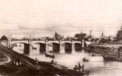 The bridge extended 145 meters across the Vistula River with five wooden spans supported by stone pillars and measured 6.8 meters in width.