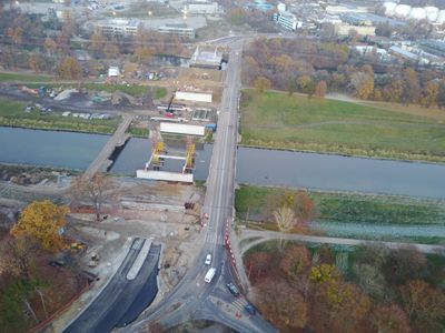 The Bolesław Chrobry Bridge consists of four spans crossing both the Navigation Canal and Flood Canal in northeastern Wrocław.