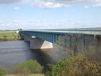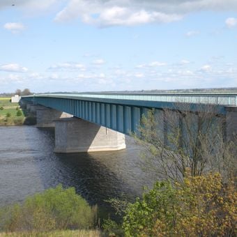 Nine distinct spans characterize this nearly kilometer-long bridge, making it a notable engineering structure in northern Poland.