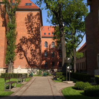 The Professor's Garden spans 0.15 hectares between Collegium Maius and Collegium Witkowski, featuring stone paths, wooden benches, and carefully selected plants.