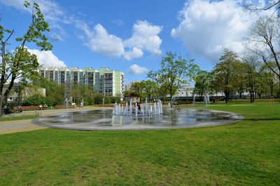 Znicza Park stretches across 1.9 hectares of land with tree-lined avenues, featuring common maples, sycamores, silver linden, and poplars throughout the grounds.