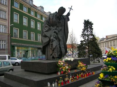 The square contains a monument to Pope John Paul II created by artist Jan Kucz in 1999, replacing earlier monuments that marked different historical periods.