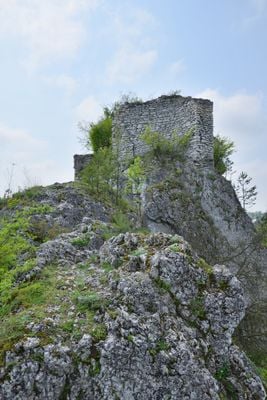 The stone castle ruins stand on a limestone cliff within the Polish Jura Chain, featuring remnants of defensive walls and foundation structures.