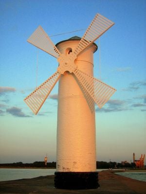 The structure combines the appearance of a traditional windmill with modern navigation technology, emitting precise light signals for ships.